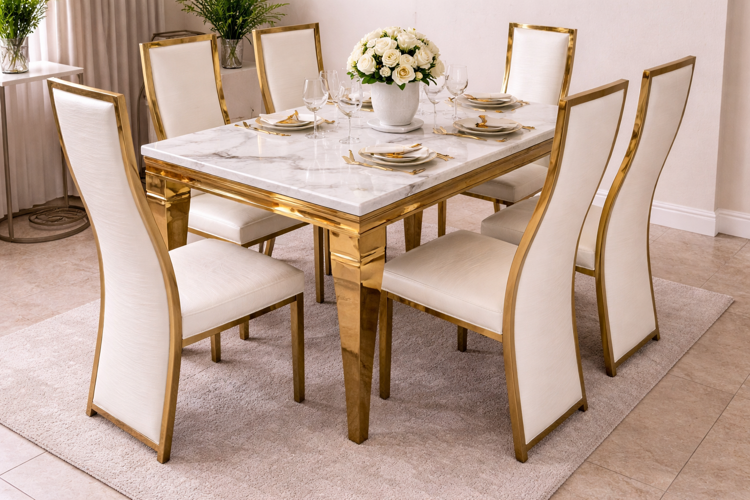 Transform your dining space with this elegant6-seater marble dining set with gold accents, designed to bring sophistication, comfort, and timeless beauty into your home. Not only does it create a striking visual centerpiece, but it also delivers exceptional functionality for everyday use. As a result, your dining area becomes both stylish and inviting.
