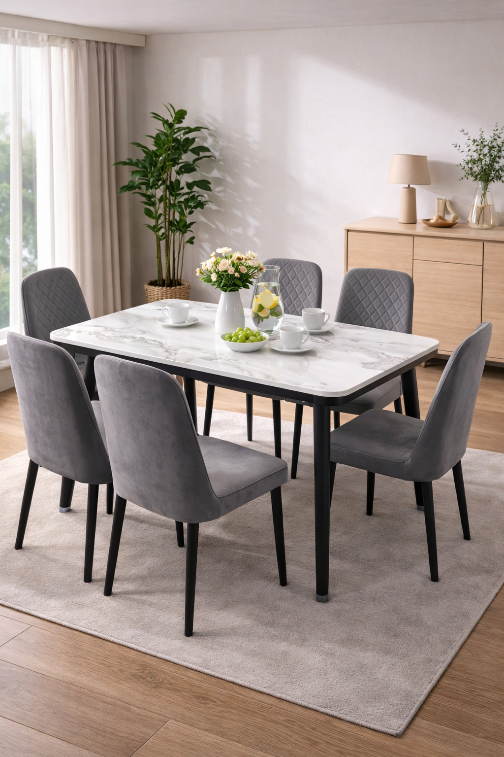 Upgrade your dining experience with this 6-seater marble top dining set, designed to bring elegance, comfort, and functionality into your home. Not only does it provide ample seating for family and guests, but it also enhances your dining area with a sleek, modern aesthetic.