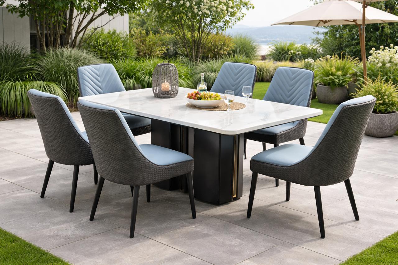 Enhance your dining space with this stylish 6-Seater White and Blue Dining Set, designed to combine elegance, comfort, and practicality. The table features a sleek glass top supported by a strong metal frame, creating a modern and sophisticated centerpiece for your dining area.