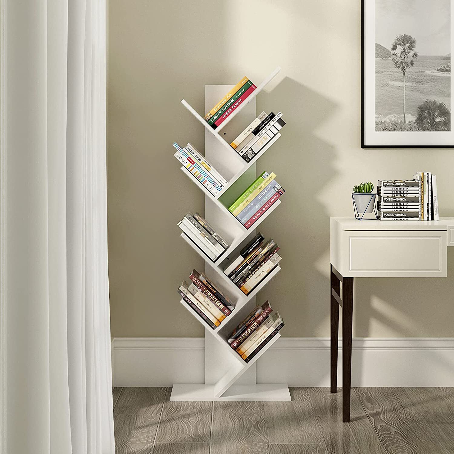 This 9-tier bookshelf serves multiple functions beyond storing books. Moreover, its modern design blends with living rooms, offices, libraries, and study rooms. Additionally, it works as a room divider in open-plan spaces or a display shelf for art, plants, and collectibles.