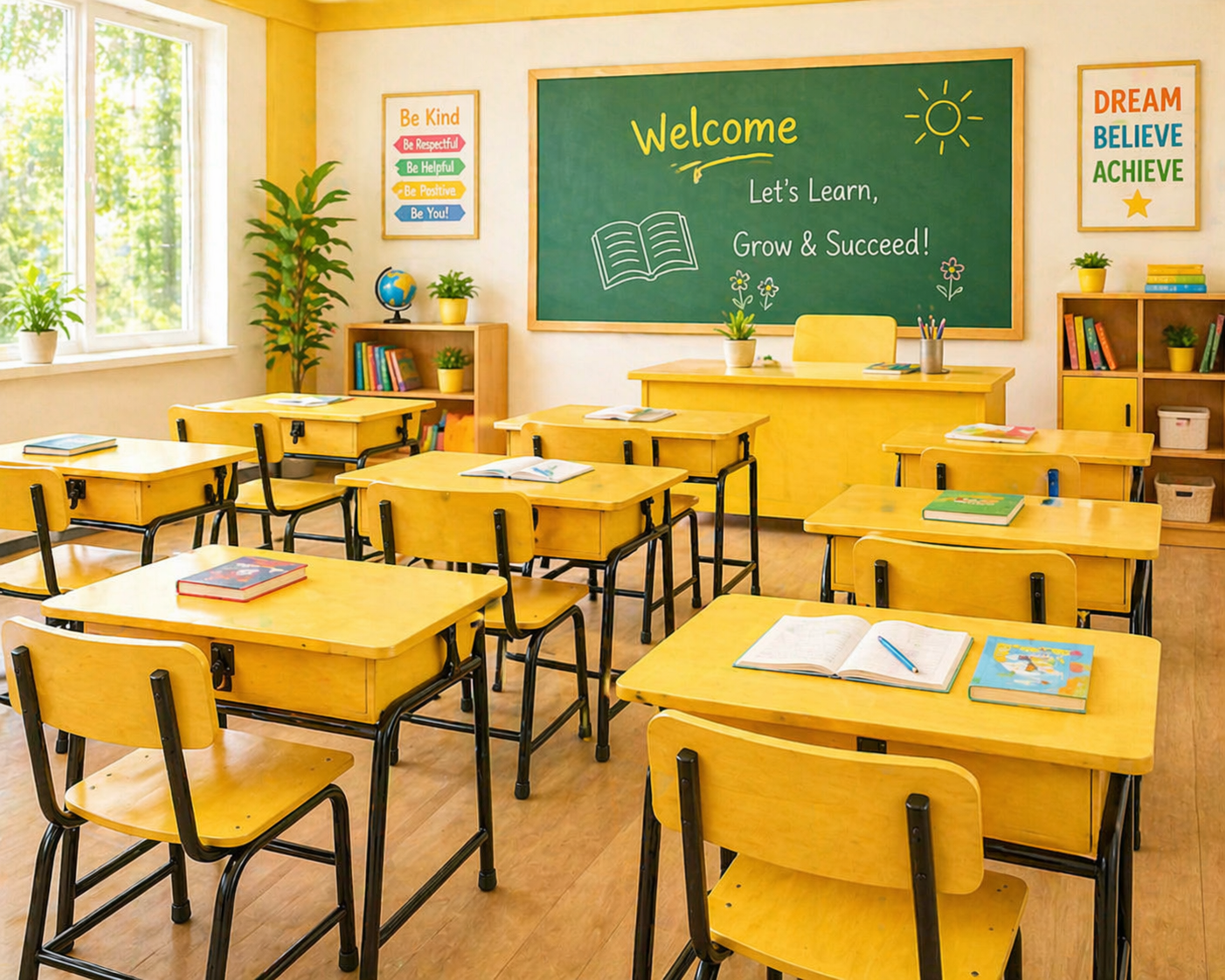 Firstly, the vibrant yellow tone instantly uplifts the classroom atmosphere and encourages positivity among students. As a result, learners feel more engaged and willing to participate in class activities. Moreover, a well-organized classroom equipped with visually appealing furniture improves concentration and helps maintain discipline. At the same time, the clean and modern layout enhances both functionality and overall aesthetics, creating a balanced and effective learning space.