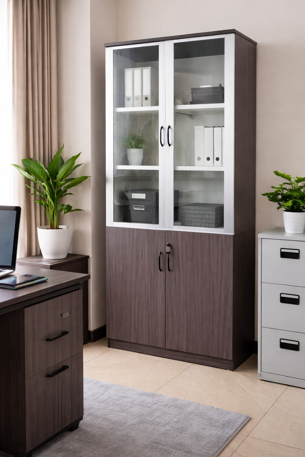 Upgrade your workspace with this half glass two door filing cabinet. It combines style, organization, and security in one unit. Moreover, it helps create a clean and professional office environment. As a result, your workspace feels more efficient and visually appealing.