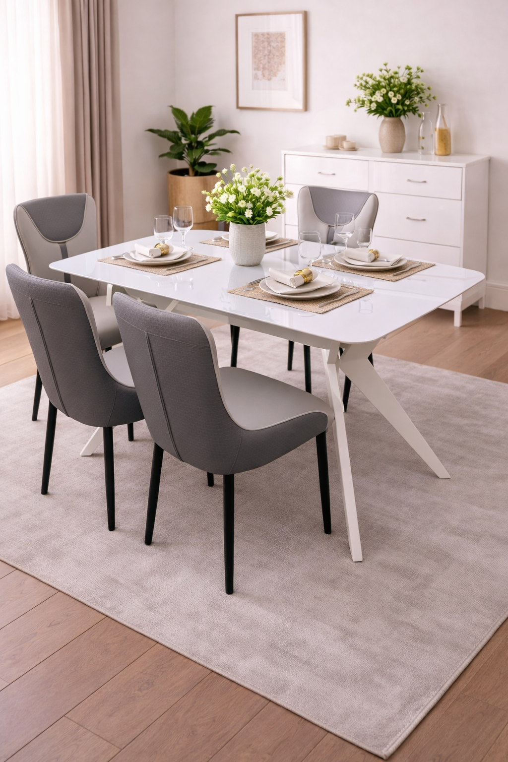 Upgrade your home with this modern 4-seater dining setup with minimalist design. It blends simplicity, comfort, and functionality. Moreover, it creates a clean and calming dining atmosphere. As a result, your space feels more open and inviting.