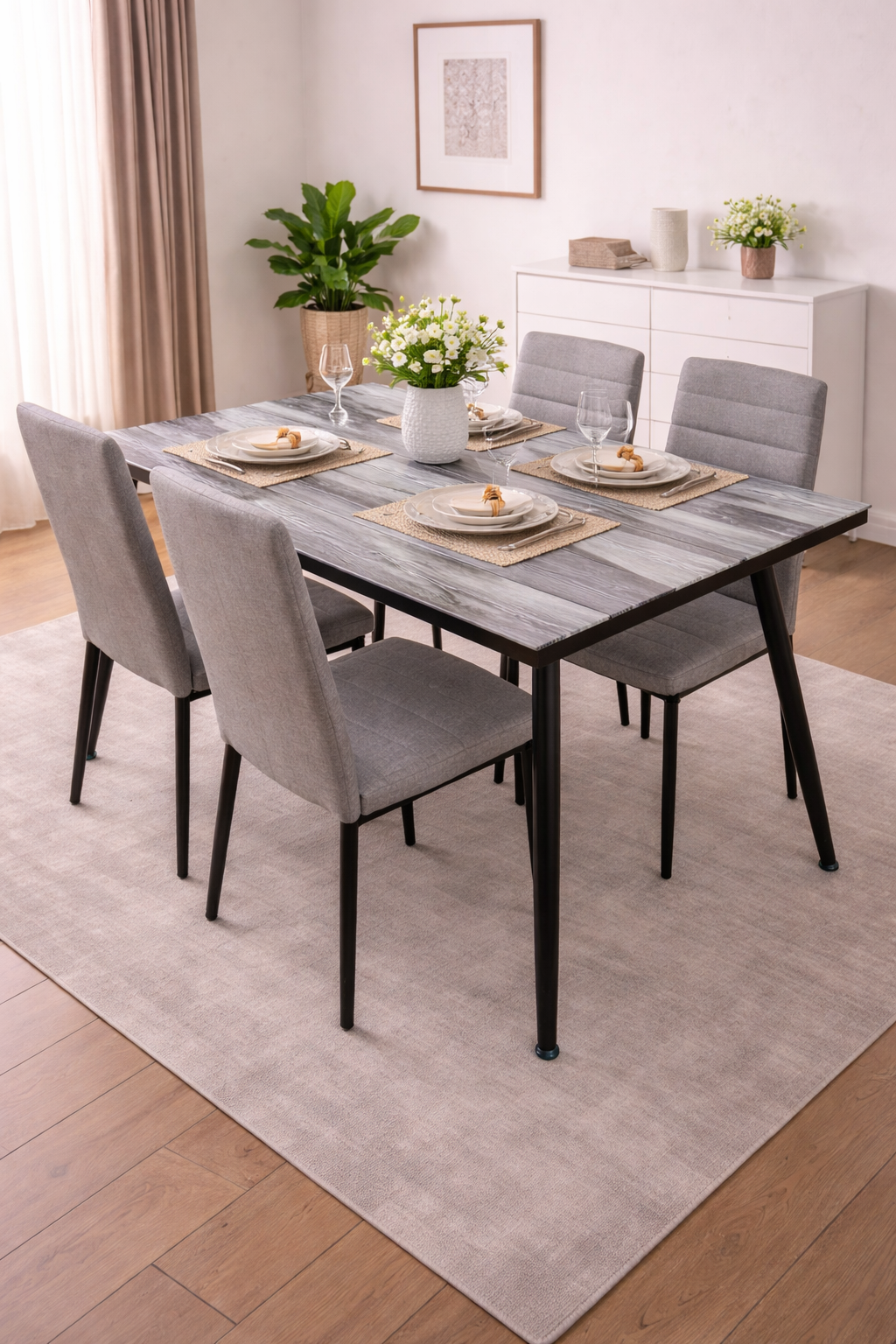 Upgrade your home with this modern 4-seater rustic dining setup. It combines natural textures, modern design, and everyday functionality. Moreover, it creates a warm and inviting dining atmosphere. As a result, your space feels both stylish and comfortable.
