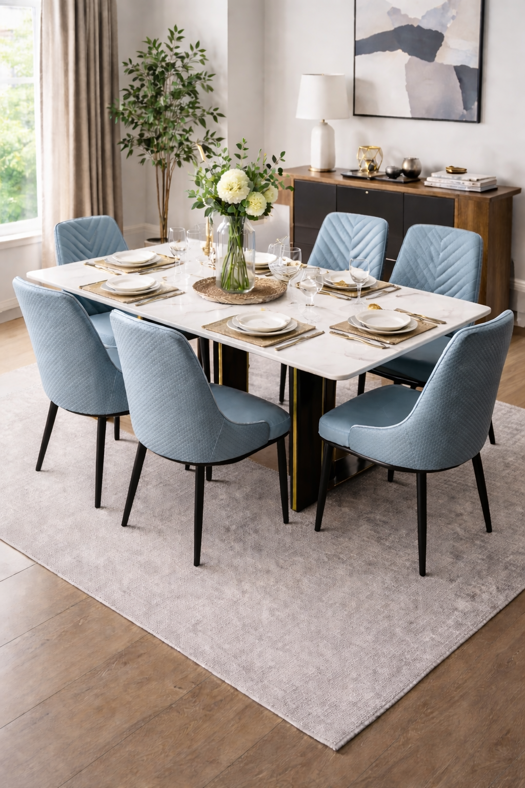 Upgrade your dining space with this stylish modern 6-seater marble top dining set. Not only does it bring elegance, but it also adds functionality to your home. The sleek marble-patterned tabletop creates a luxurious feel. At the same time, its clean lines blend seamlessly with modern interiors.