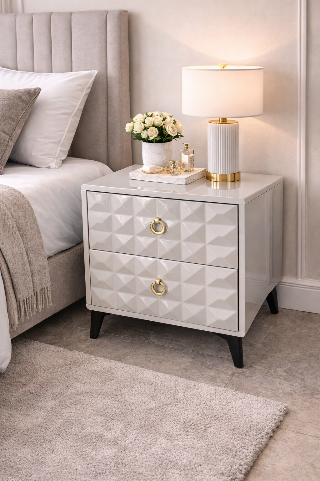 This bedside table features a sleek glossy finish combined with a unique geometric drawer pattern that adds depth and visual interest. In addition, the gold ring handles introduce a luxurious touch that instantly catches the eye.