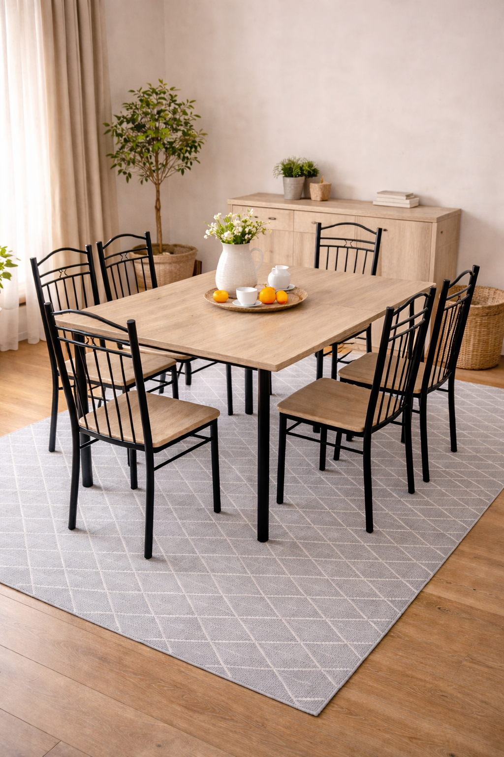 The natural wood finish adds warmth to your space. At the same time, the black metal structure introduces a modern edge. This balance makes the set suitable for different interior styles. For example, it fits well in minimalist, industrial, and Scandinavian homes.