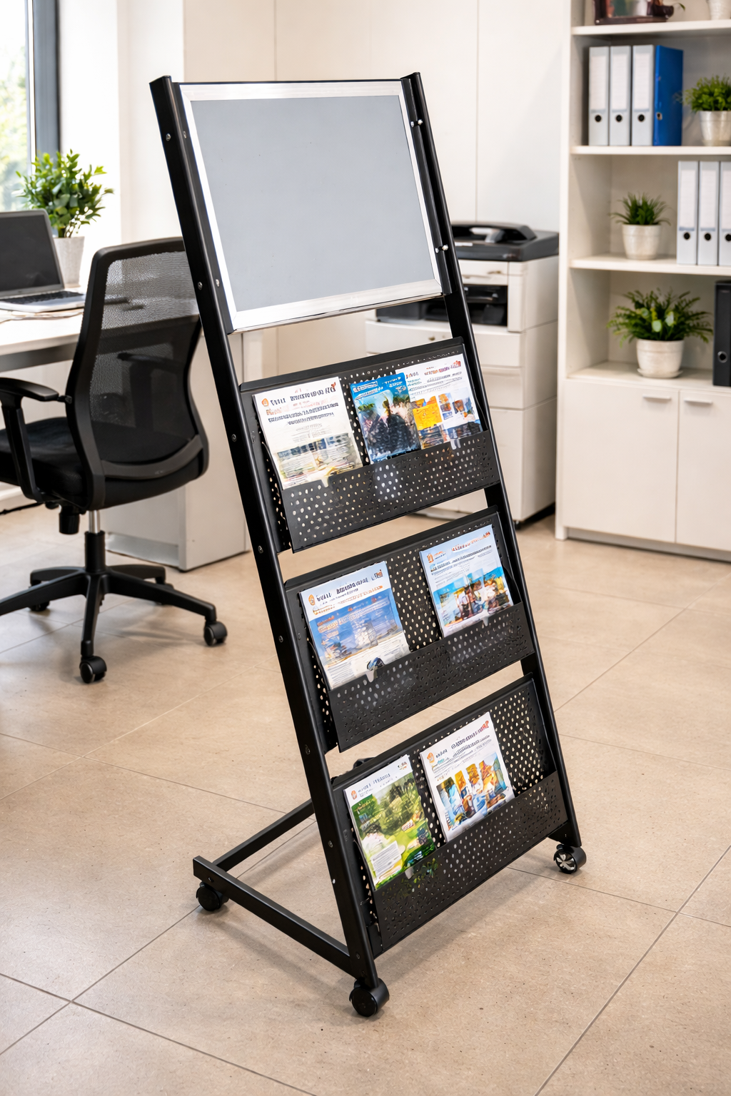 This display rack is highly versatile. It works well in reception areas, corporate offices, retail showrooms, and exhibition spaces. In addition, it is perfect for clinics, schools, and business centers where organized information display is essential.