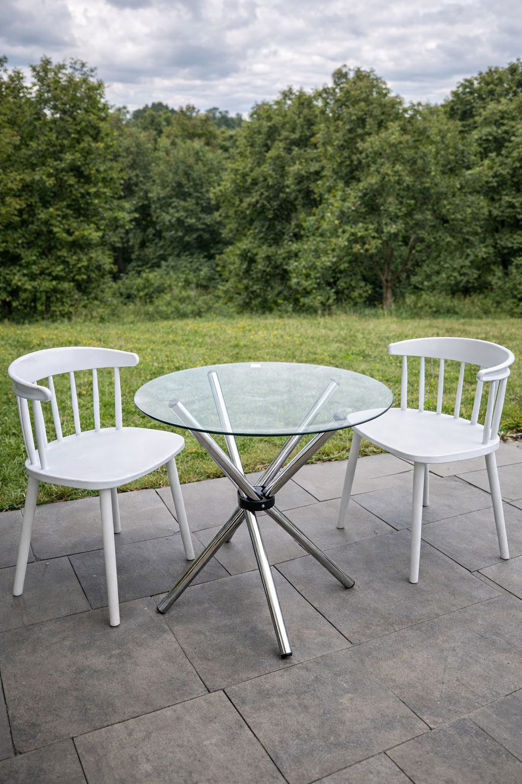 This modern patio dining set stands out because of its minimalist yet elegant design. The round glass tabletop adds a touch of sophistication, while the sturdy metallic base provides a modern industrial feel. In addition, the matching chairs feature a smooth finish and ergonomic shape, which enhances both comfort and visual appeal.