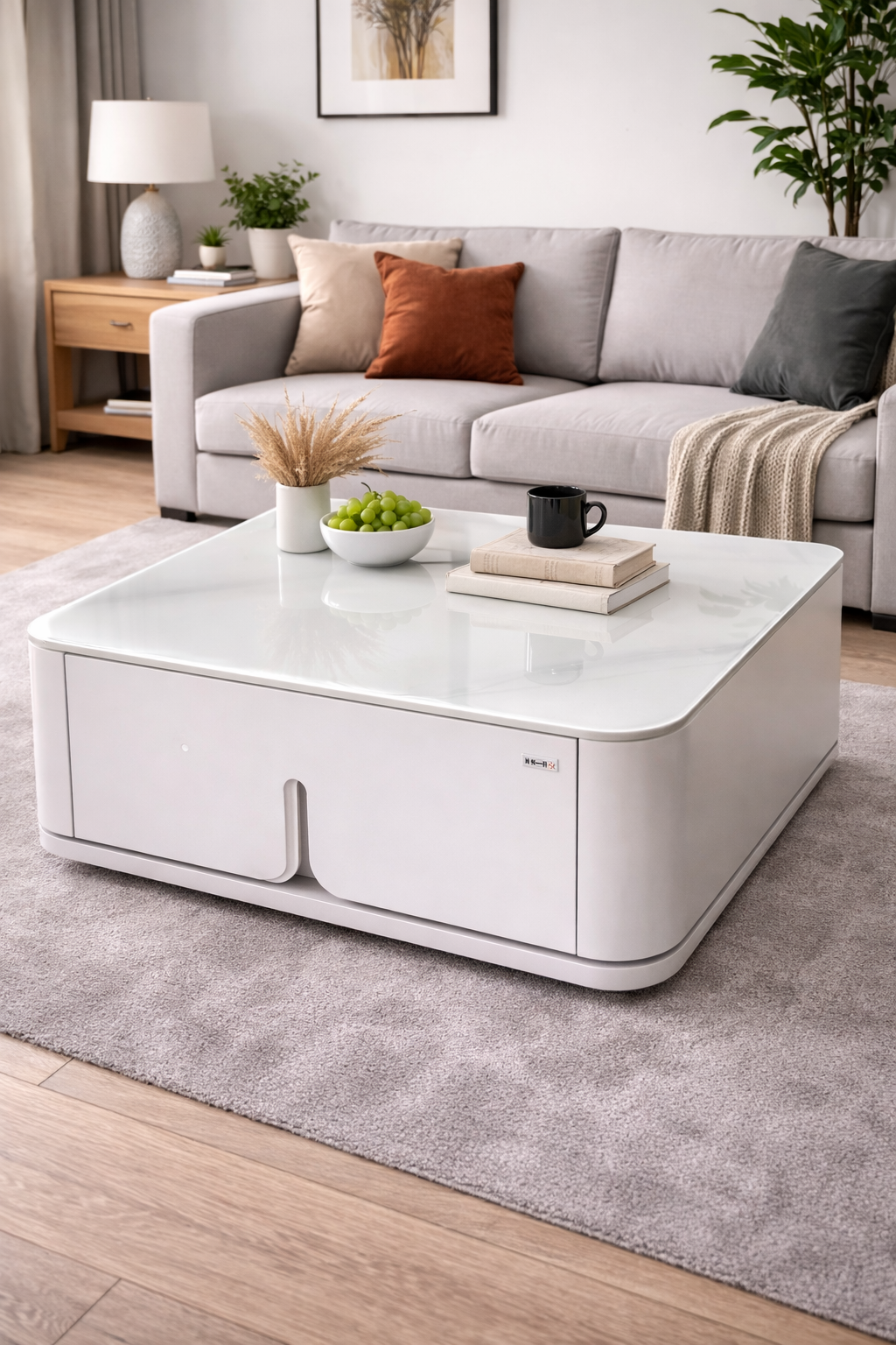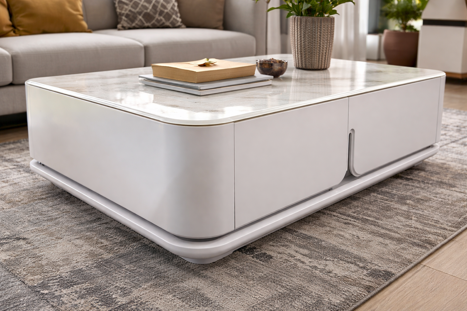 First of all, the table features a smooth, glossy finish with rounded edges, which gives it a refined and modern look. In addition, the clean lines and neutral color enhance the overall aesthetic of your space. As a result, your living room appears more organized, stylish, and inviting.