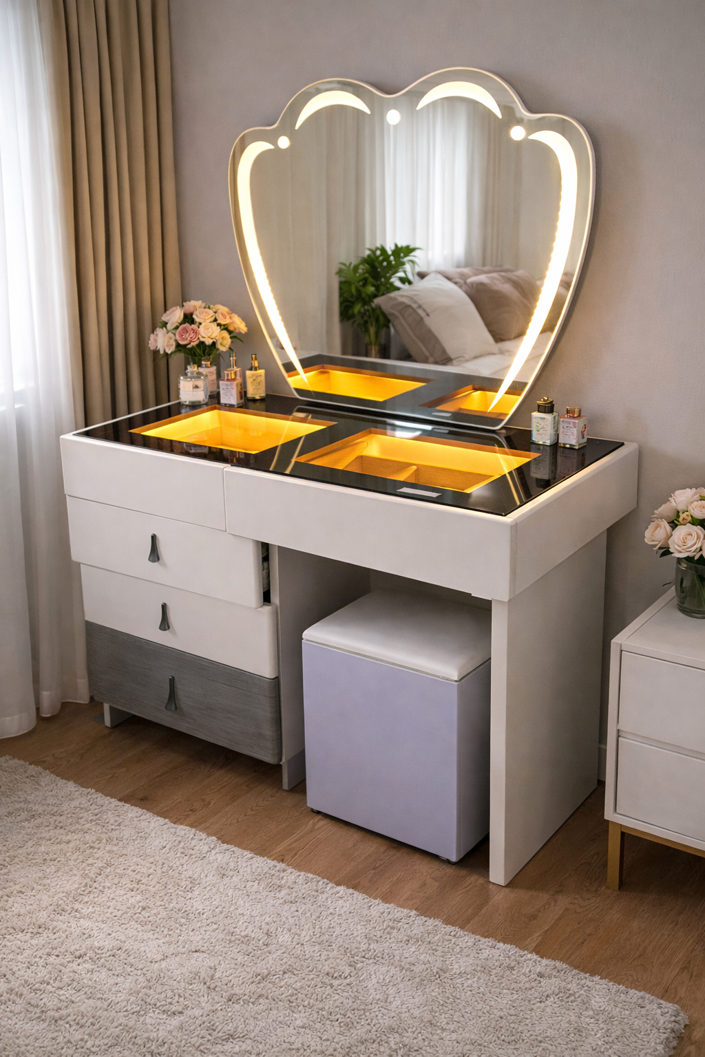 Transform your bedroom into a luxurious and functional beauty space with this modern vanity with a heart-shaped mirror. This piece combines elegance, practicality, and contemporary design to create the perfect setup for your daily routine. To begin with, the unique heart-shaped mirror immediately draws attention and adds charm to any room.