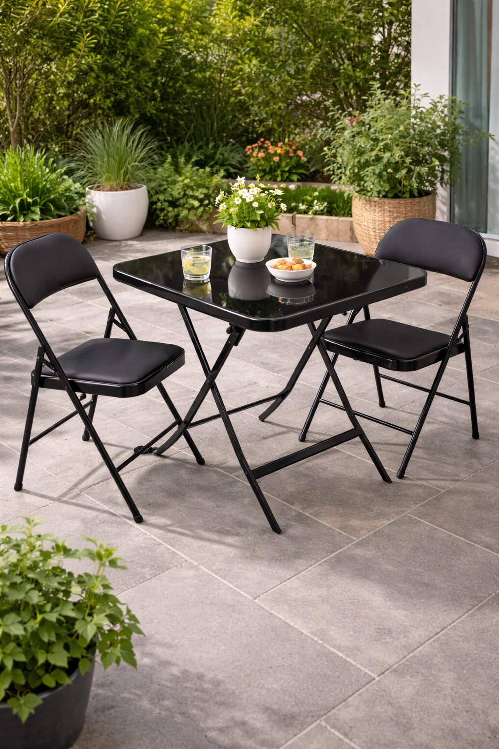 The table and chairs are foldable therefore offer a compact structure. As a result, they fit easily in patios, balconies, or gardens. In addition, the foldable design allows easy storage.