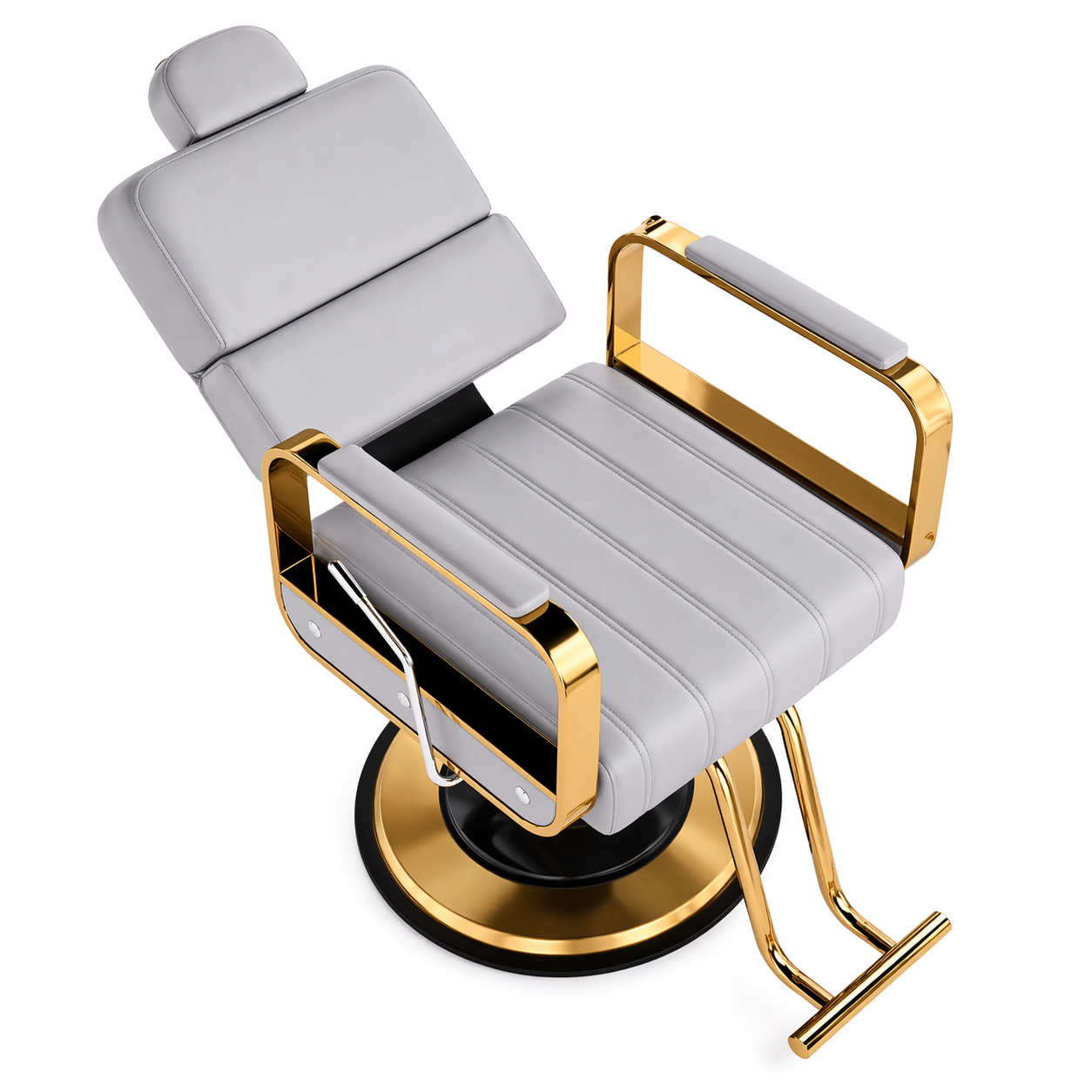 Upgrade your grooming space with this reclining hydraulic pump gray and gold barber chair, designed to combine elegance, comfort, and performance. The sleek gray upholstery paired with a striking gold metallic frame creates a premium look that instantly elevates any barbershop or salon. Moreover, its modern design blends perfectly with high-end interiors.