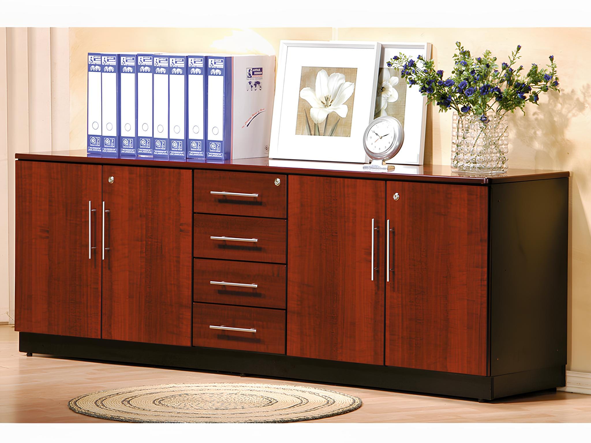 Moreover, the neutral finish allows the credenza to blend seamlessly with different office decors. Whether used in executive offices, meeting rooms, or home offices, this credenza combines practicality and style. Consequently, it becomes a versatile storage solution for all your organizational needs.