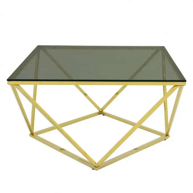 Elevate your living space with this square glass coffee table featuring a black tempered top and a geometric gold metal base. Firstly, the tempered glass surface provides durability and a sleek, modern look that complements any decor.