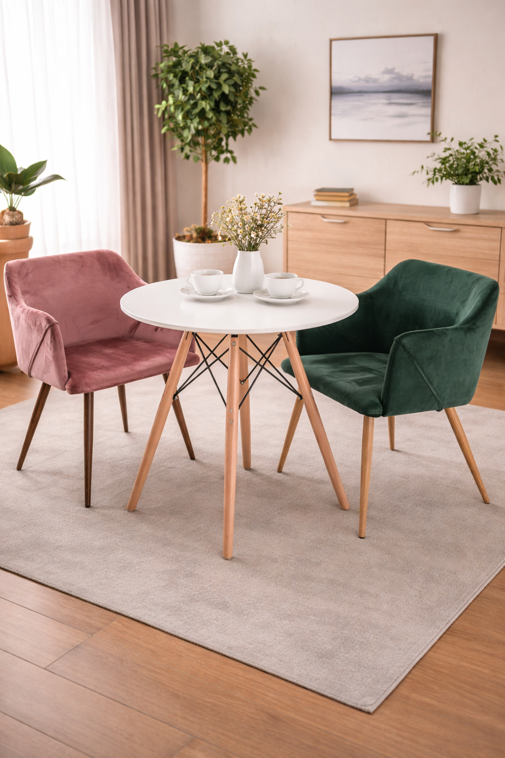 Elevate your home with this stylish dining set with velvet chairs. It is designed to bring elegance and comfort into your dining space. The compact round table and soft velvet seating create a warm and inviting atmosphere. This makes it perfect for both everyday meals and relaxed conversations.